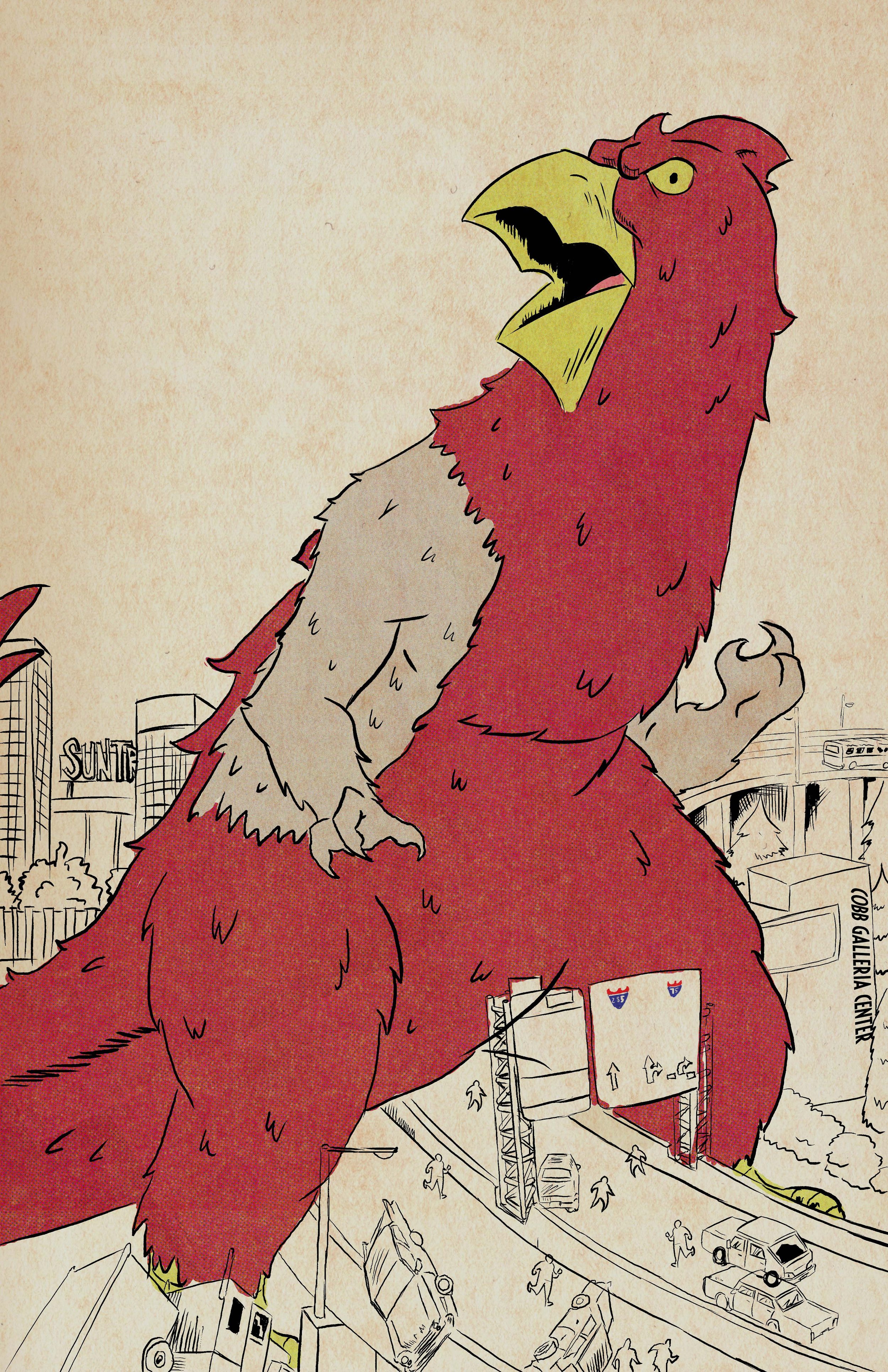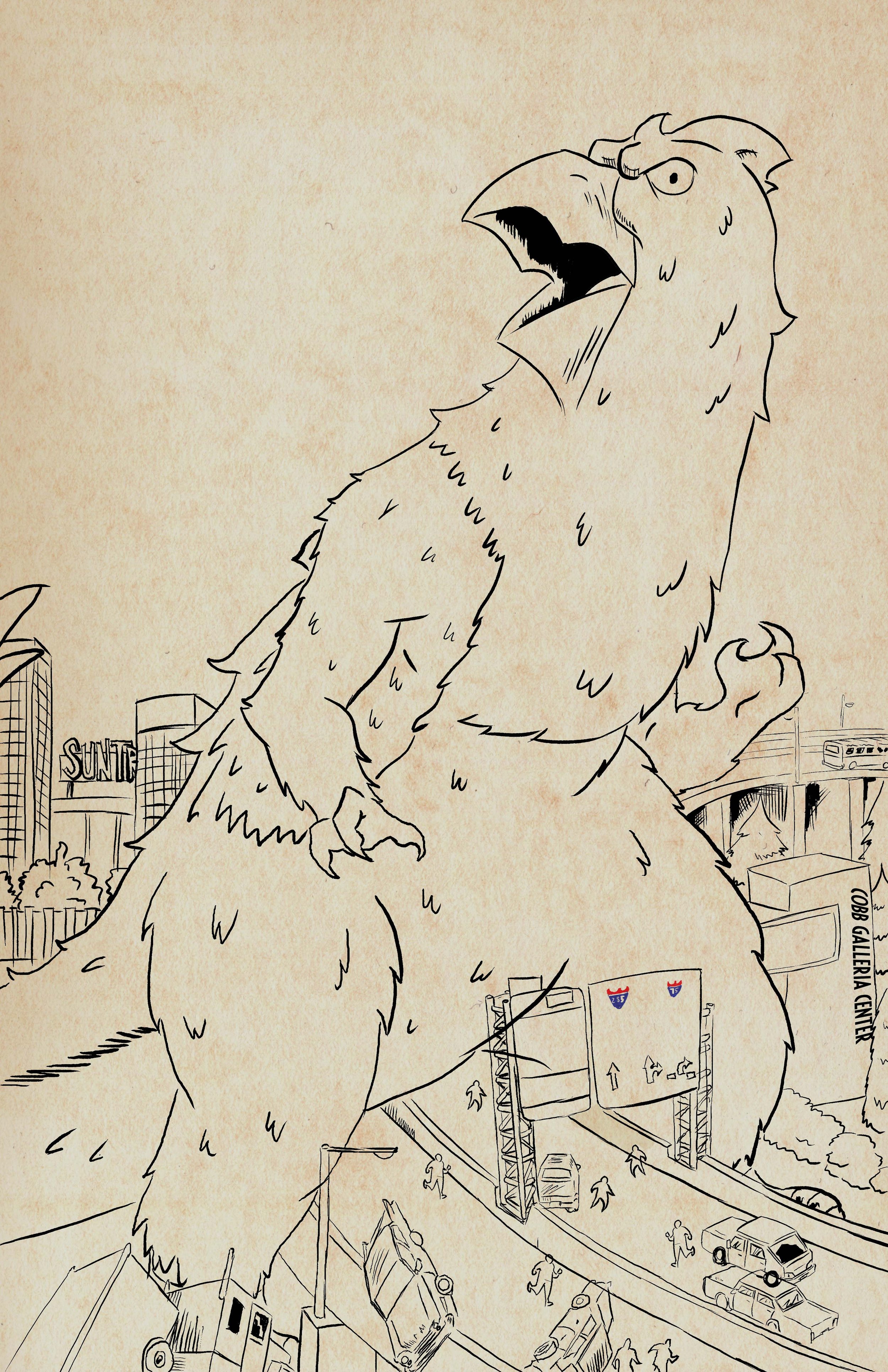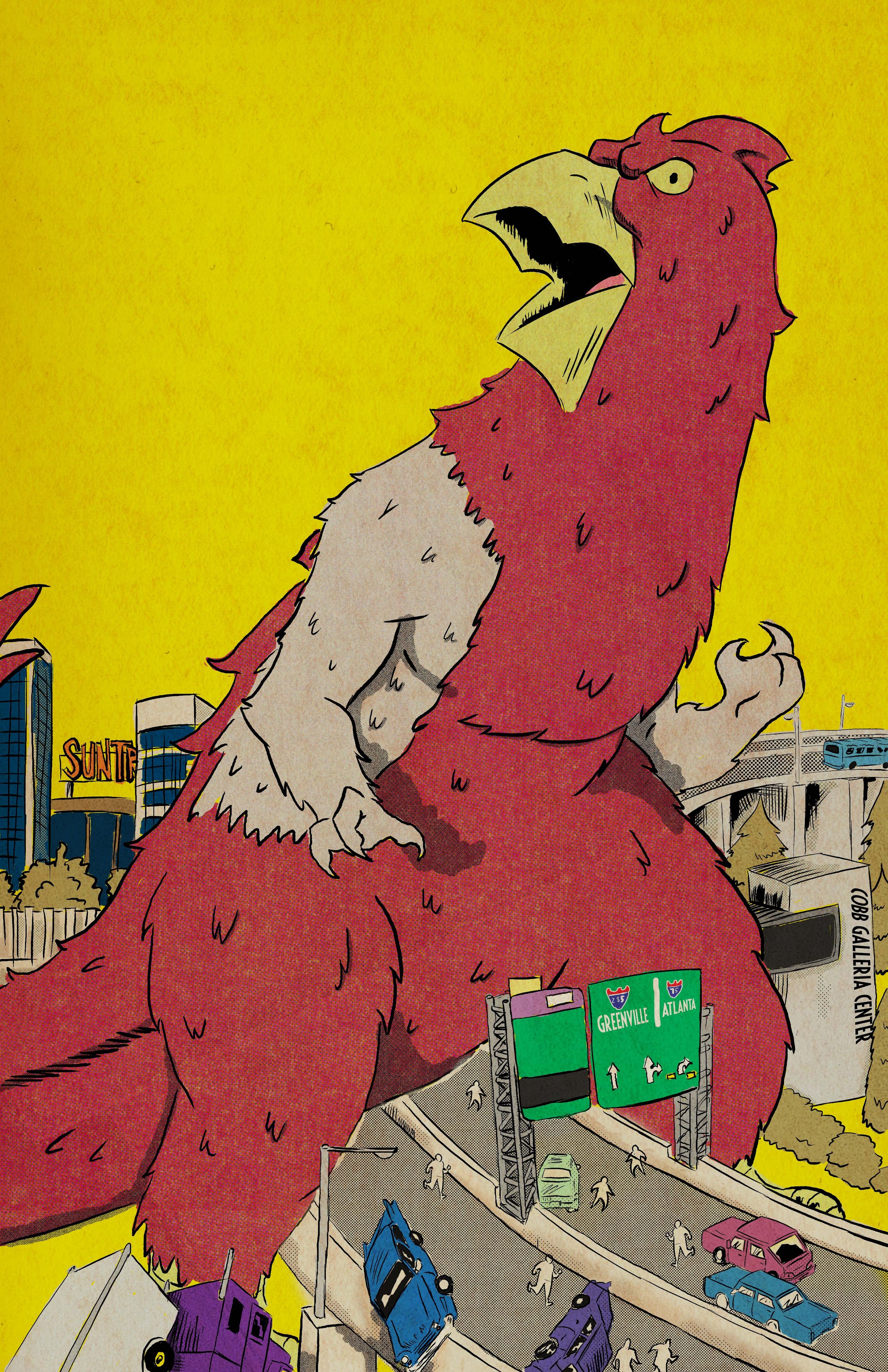 Now, when you’ve got a kaiju-sized chicken stomping through Cobb County, you’ve got to make sure that baby pops! To give Cobbzilla the star power it deserves, I inked it with a heavier line weight using Alex Dukal's set of cartoonist’s brushes.